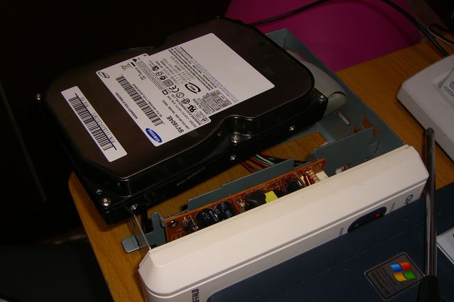 | 先日カミさんが消したデータの復旧と、ついでに160GB→500GBへの容量UPのため、とりあえず分解。 まずはCD/DVDトレイの前面パネルを外して、本体のネジを取り、上蓋を外す。 |