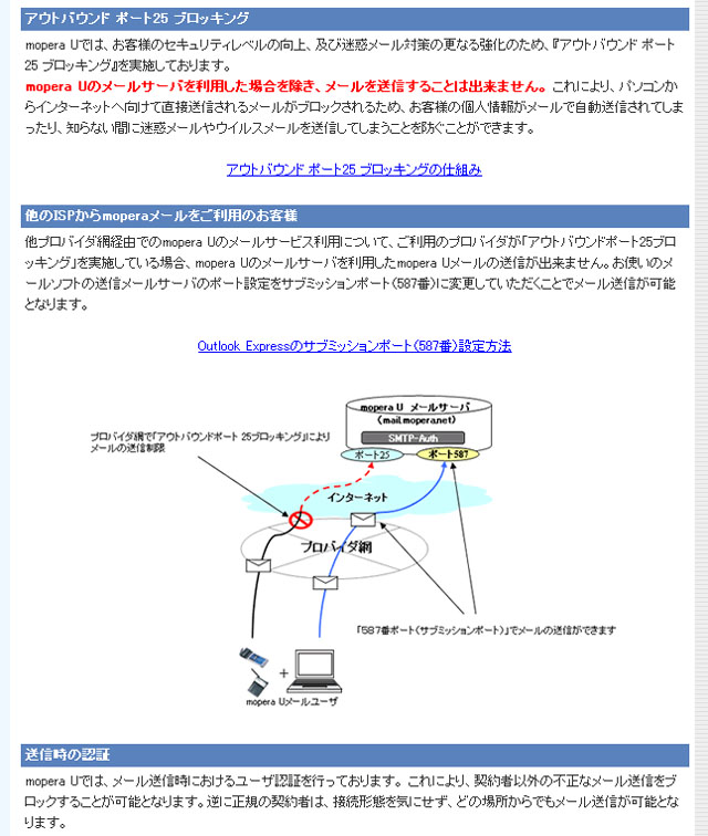 ・他社ISPの25portはアウトバウンドされているのでサブミッションポートでのsmtp認証かpop/smtp over SSLを利用しないと送信できない