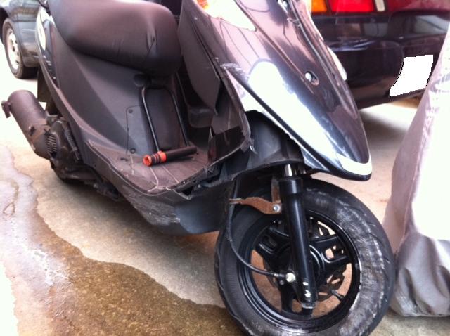 側溝脇の石垣でカウルはかなりえぐられたように割れてしまってます。