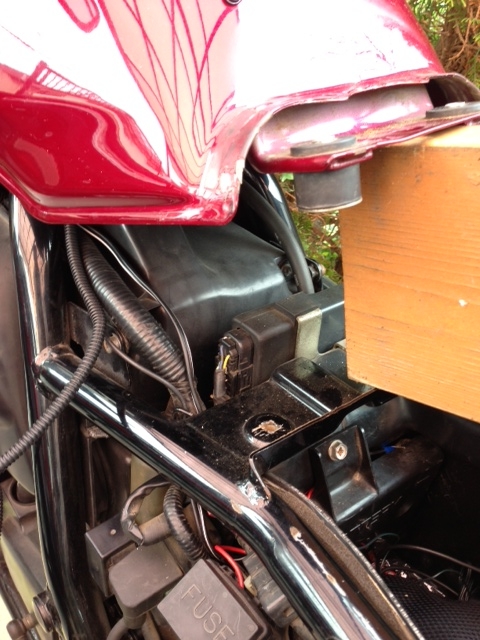 タンクはきちんと外した方が配線しやすいのだが、燃料ホースとか面倒なので2×6の木材でタンクを浮かせて配線